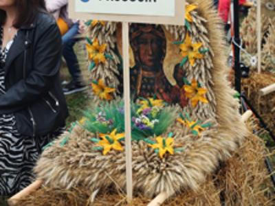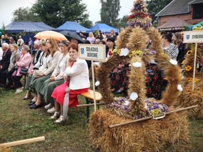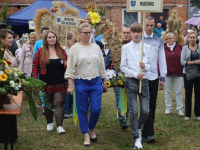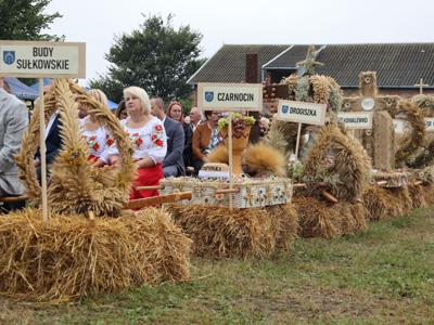 Najważniejszą i barwną część korowodu stanowiły wieńce dożynkowe przygotowane przez przedstawicieli sołectw: