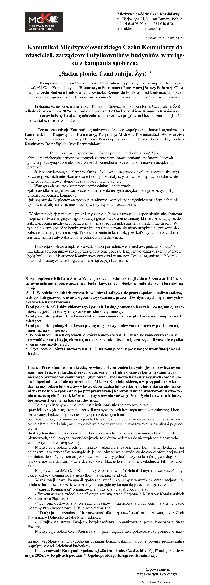 Kampania społeczna Międzywojewódzkiego Cechu Kominiarzy „Sadza płonie. Czad zabija. Żyj!